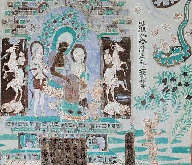 壁畫畫面右側有一飛天正在散花,云端之下是一棵茂盛的大樹,一只猴子正仰著頭,一手舉起做采摘狀。其旁側有白底墨書題記寫著“獼猴命終得生天上散花供養”。畫面右側一佛坐蓮花座之上,兩旁一弟子一菩薩協侍左右,一只猴子雙手捧一缽,虔誠地供養佛。