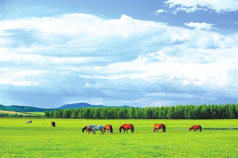 置身草原,高遠空曠的天空下面,是明凈遼闊的草場,白色的羊和黑色的牛像灑落在草叢中的白珍珠和黑珍珠,一頂頂帳篷點綴其間,不遠處,有游人騎在馬背上,優哉游哉,或拍照或奔馳。這里一年四季景色都十分迷人:春天山花爛漫,姹紫嫣紅,如煙如夢;夏季綠草如茵,碧波浪涌,養心養眼;秋天云纏霧繞,層林盡染,美麗迷人;冬天銀裝素裹,瓊花玉樹,一派北國風光。