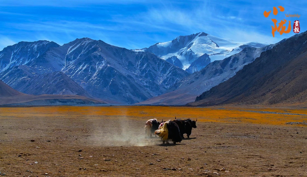 初秋,草香撲面而來,綠草漸被秋風(fēng)染黃,與雪山、藍天繪成一幅層次鮮明的風(fēng)景畫。