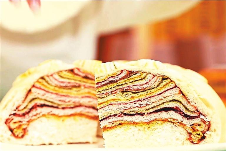 母親最拿手的還是做千層大月餅,做法與平常做饃有點(diǎn)不一樣,發(fā)好面后取適量揉好,切成同樣大小的若干份并搟壓成長方形的薄面皮。一層薄皮一層餡,餡料與烙的糖饃有的不一樣,重在色澤,每層分別抹上姜黃、紅曲、苦豆(香豆)粉、芝麻、菜籽油、糖玫瑰、葡萄干,黃、紅、黑、綠相間,一層黃一層綠一層紅一層黑,一層白糖一層紅糖一層玫瑰糖,一層一層摞好,做成一個六七層的圓餅。最后用薄皮蓋住一摞摞面皮,餅邊捏緊捏好后壓花塑形,表面用模型壓花,用專用做飯梳子一行行點(diǎn)上,或一行白鷺上青天,面皮如一塊畫布,精雕細(xì)琢,怎么好看怎么做,做得隨心所欲又精心設(shè)計。還會刷姜黃與菜籽油拌好的油料,撒上芝麻粒和葡萄干,一個千層餅就基本成型了。
