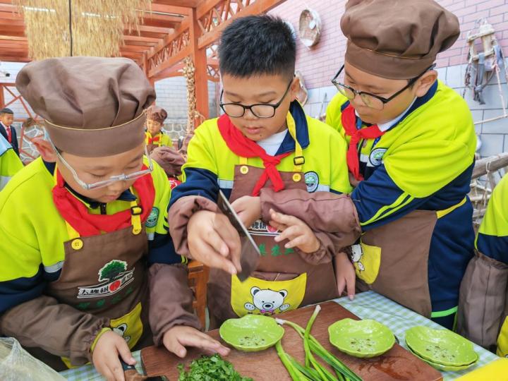 蘭州市城關(guān)區(qū)伏龍坪小學(xué)六年級1班的裴玉龍(左一)和同學(xué)們動手嘗試切蒜苗。新華社記者 白麗萍 攝