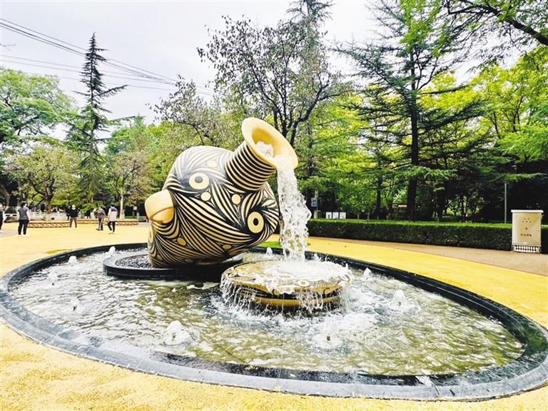 走進公園(東口),入口處以“大河厚土孕彩陶”為主題的彩陶墻格外顯眼,墻上鑲嵌著不同造型和樣式的彩陶,分別介紹了大地灣文化彩陶、仰韶文化彩陶、馬家窯文化彩陶、齊家文化彩陶四個不同歷史發展時期。沿健身步道向西行進,體量巨大的馬家窯旋紋彩陶尖底瓶正向旋紋彩陶盆內倒入“黃河之水”,這一景觀便是“彩陶流水”節點,景觀造型采用跌水、涌泉的形式,打造出彩陶流水的動態效果,象征著黃河文化的源遠流長。