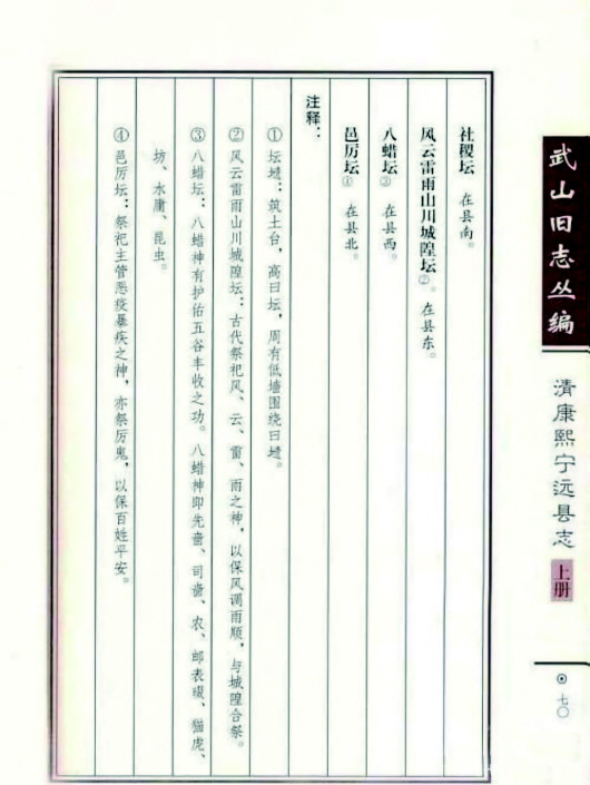 《清康熙寧遠縣志》也有記載:“風云雷雨山川城隍壇,在縣東。古代祭祀風、云、雷、雨之神,以保風調雨順,與城隍合祭。”“風云雷雨壇”:“在城東郊外,祭用春秋二仲上巳日,設三壇,風云雷雨居中,山川居左,城隍居右,陳設與社稷同,城隍廟與風云雷雨壇合祭。”