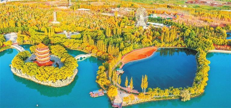 玉門市玉澤湖公園湖水澄澈,絢麗多彩。新甘肅·甘肅日報(bào)記者 馮樂凱