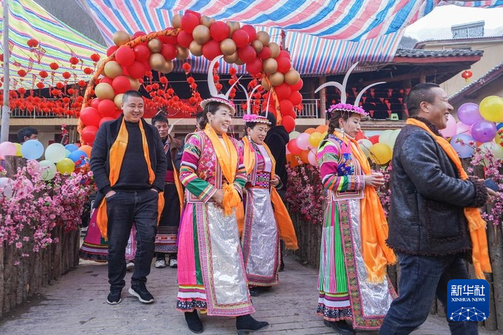 2022年1月13日,在隴南市文縣鐵樓藏族鄉(xiāng)寨科橋村,婚禮宴席結(jié)束后賓客到村寨中走親訪友。新華社記者 郎兵兵 攝