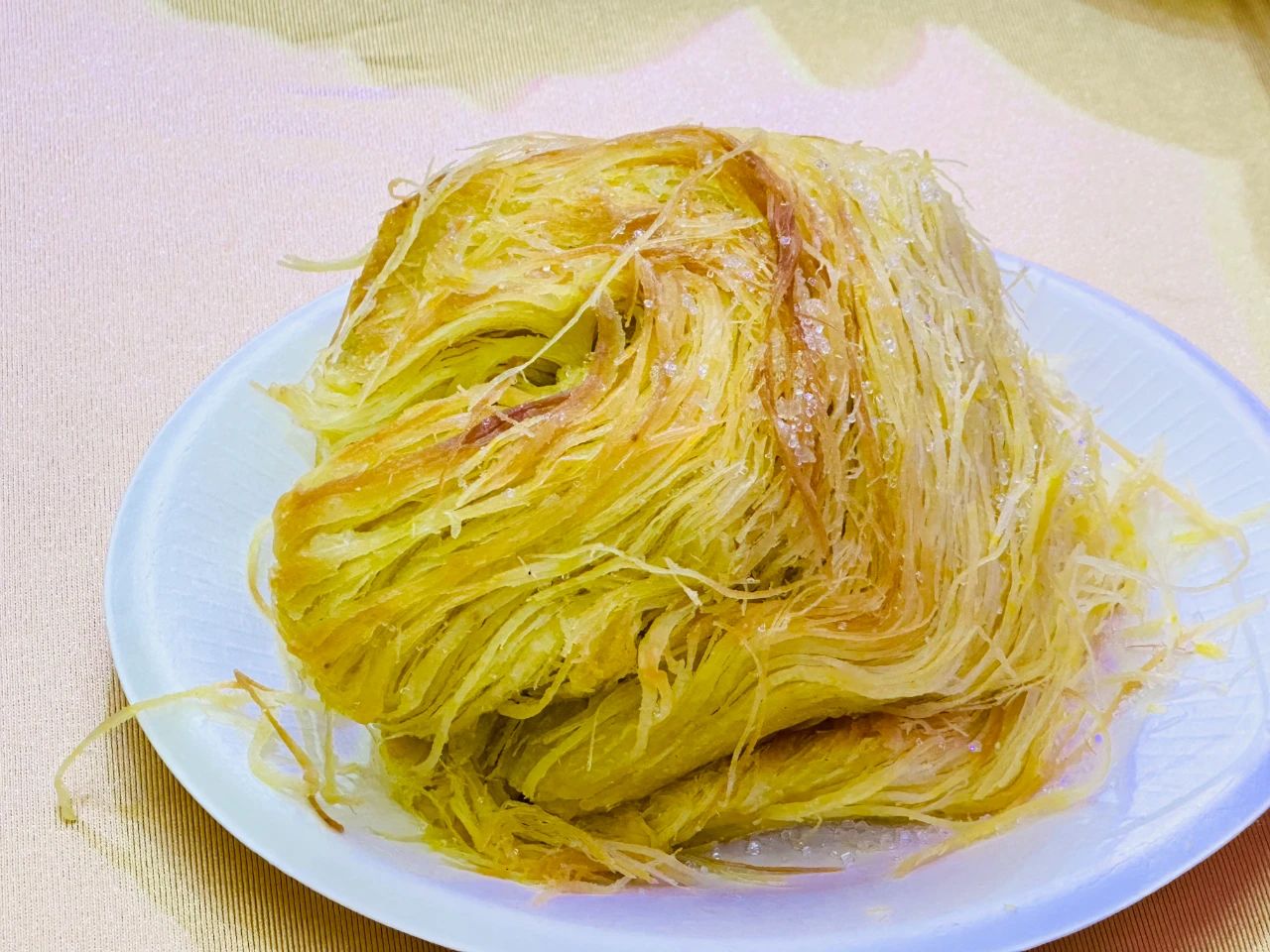 一窩絲的制作是一門精細的藝術。面粉、水、鹽和油巧妙混合,揉成光滑面團后,反復地拉伸、對折,直至那面團細如發絲,再盤成一團放入烤箱中,逐漸變得金黃酥脆。吃起來,那口感是層層疊疊的酥,帶著淡淡的油香,每一根絲在齒間斷裂,釋放出獨特的風味。