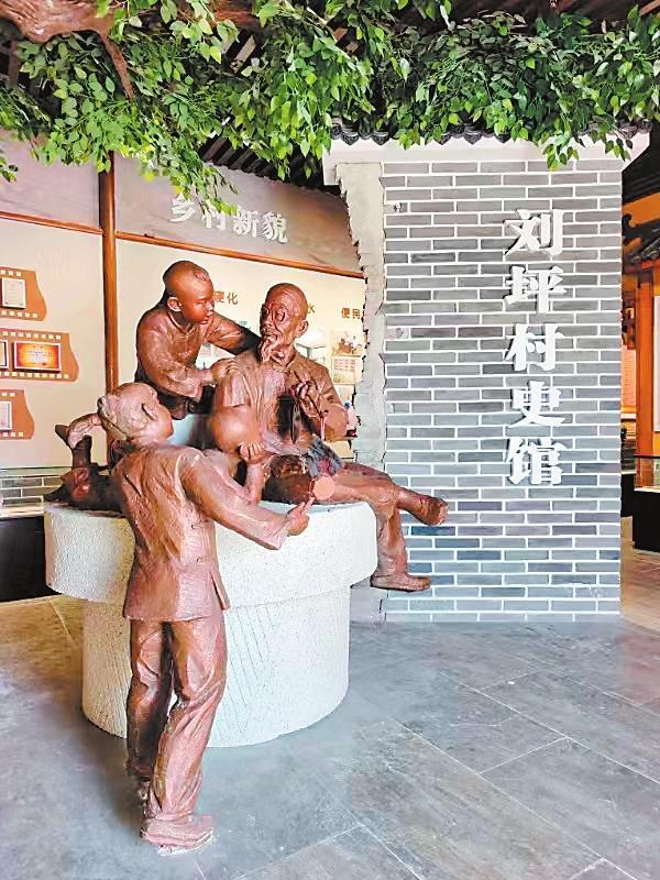 年復一年的寒來暑往中,大榆樹,也就成了劉坪村的望鄉臺。每個村莊,都有它的望鄉臺,它承載著人們共同的記憶,是人們重溫鄉愁的地標,永遠鐫刻在人們的心底。2000年,電視劇《黃沙下面是沃土》的劇組來到劉坪村拍攝取景,村里的望鄉臺大榆樹被拍進電視劇畫面。在劉坪村村史館布設中,專家和學者數易村史館方案,最終確定在村史館正門之內塑造一組雕塑,意思是由一位老人講述劉坪村的村史,作為村史館的題眼,村史館內還陳列了《劉坪村志》,分為建置、地理、村落文化、風土人情等14卷,共40萬字。館內能播放劉坪村村史專題片《耕讀傳家》。