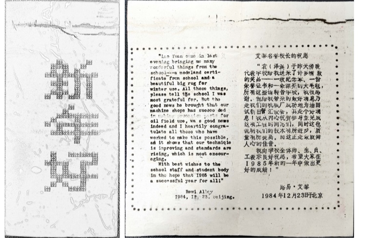 證書是由石油工業部培黎石油技校申報的。1984年12月30日,培黎石油技校自制的新年賀卡內頁用中英文印上了名譽校長艾黎的祝愿: