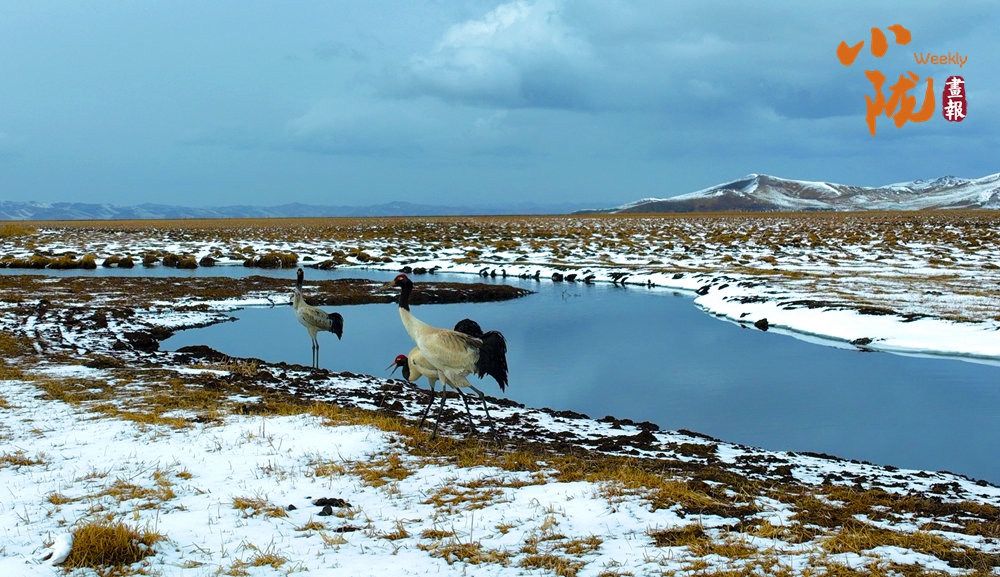 “高原精靈”黑頸鶴身披黑白相間的羽衣,舒展著身體,或低頭覓食,它們優雅的身姿成為冬日里一道亮麗的風景線。