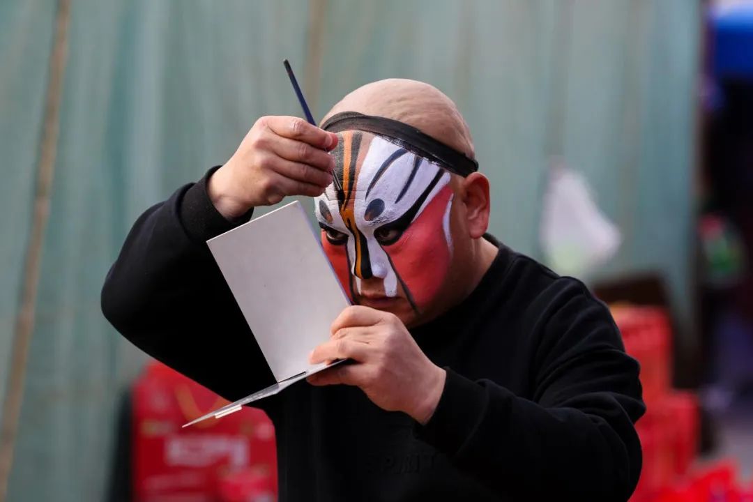 換好戲服,化好戲妝,戴上頭冠,鑼鼓響起,大幕拉開,演員一開口,吼出一嗓高亮秦腔,嘯出黃天厚土的氣魄,臺下響起震雷般的掌聲。一時間,臺上臺下,你唱我和,慷慨激昂的唱詞從每個人的胸腔吼出,有熱淚在流,有情緒在涌動,這是西北人的年,是西北人的歲月狂歡。