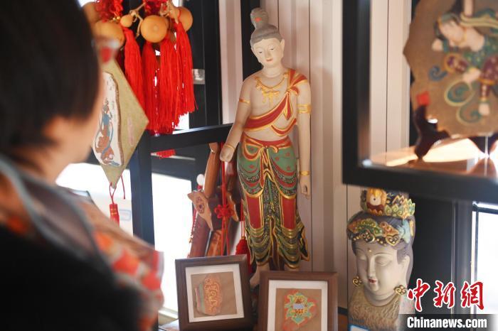 2月8日,甘肅省蘭州市城關區“非遺年貨購物月”活動現場,游人挑選敦煌系列文創產品。中新社記者 李亞龍 攝