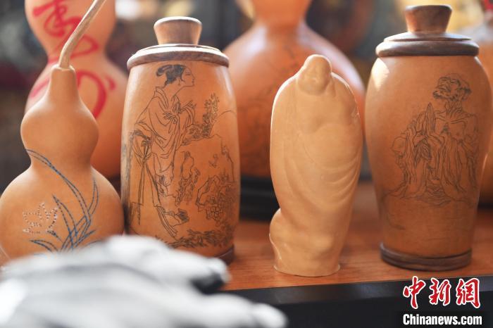 2月8日,甘肅省蘭州市城關區“非遺年貨購物月”活動現場展出的刻葫蘆文創產品。 中新社記者 李亞龍 攝
