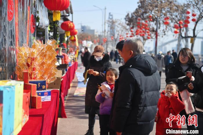 2月8日,甘肅省蘭州市城關區“非遺年貨購物月”活動現場,游人購買蘭州三炮臺、糖畫等傳統美食。 中新社記者 李亞龍 攝