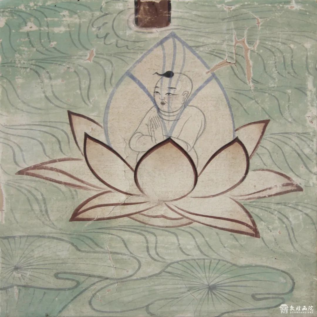 這幅臨摹于榆林窟25窟的化生童子雙手合十,外面蓮花瓣層層盛開,透過透明的花苞可以看到童子即將降生,生動可愛,和電影中的情節遙相呼應。