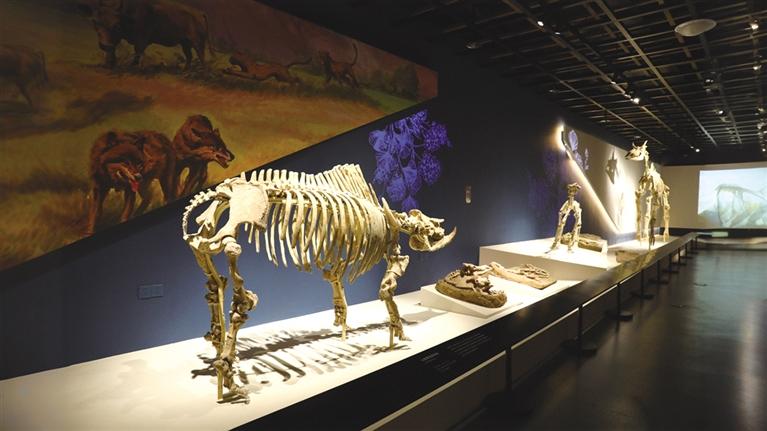 本次展覽以“黃河之畔的遠(yuǎn)古哺乳動(dòng)物”為核心,通過(guò)環(huán)境再現(xiàn)、現(xiàn)場(chǎng)還原、多媒體互動(dòng)等形式,全面展示了古動(dòng)物的體型結(jié)構(gòu)、生活習(xí)性和生存環(huán)境。展覽內(nèi)容主要分為巨犀動(dòng)物群、鏟齒象動(dòng)物群、三趾馬動(dòng)物群、真馬動(dòng)物群四部分。通過(guò)一系列珍稀的古動(dòng)物化石,生動(dòng)再現(xiàn)了黃河流域遠(yuǎn)古生態(tài)系統(tǒng)的壯麗圖景和生物多樣性的豐富面貌。
