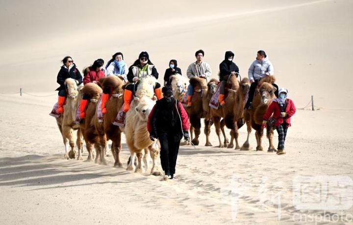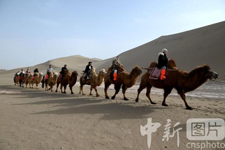 2025年3月2日,游客在甘肅省敦煌市鳴沙山月牙泉景區游覽。