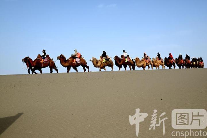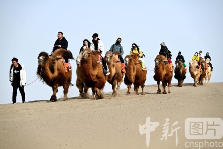 2025年3月2日,游客在甘肅省敦煌市鳴沙山月牙泉景區游覽。從3月1日開始,至3月31日,甘肅省敦煌市鳴沙山月牙泉景區、世界文化遺產玉門關遺址、敦煌雅丹世界地質公園三大市屬景區推出門票半價優惠政策,吸引游客走進敦煌,欣賞大漠風光,體驗絲路風情。中新社發 張曉亮 攝