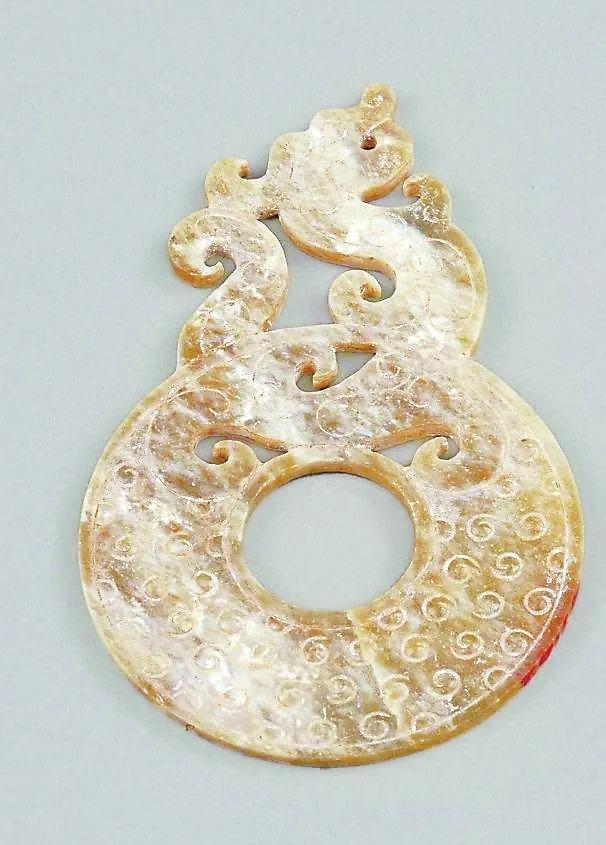 玉璧通高11厘米、直徑6.9厘米、孔徑2.4厘米、厚0.4厘米,征集品。玉料為青玉,整體顏色為青灰色,有灰白沁。琢磨成形,體呈平片狀。下部呈圓形,中有圓孔,孔徑小于肉寬,三分之二雕稀疏谷紋。龍首與龍尾出于璧廓之外,腹部鏤雕在璧孔之上的肉部,有三個一端彎鉤的三角狀鏤孔,其中下部兩個鏤孔左右對稱。龍昂首,軀體屈曲,尾部卷而上貼首后,有騰空而起之勢。龍首尾之間有一個不規則的大鏤孔,龍嘴上有一圓形小系孔。