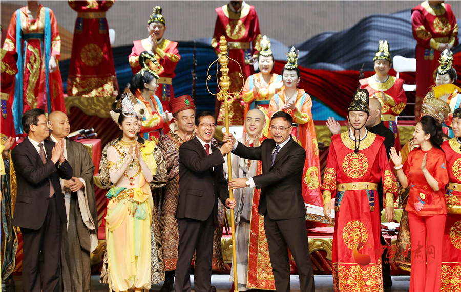 《玄奘西行》作為世界首部大型民族器樂劇,以絲綢之路文化交流使者玄奘的歷史故事為題材,集多民族樂器演奏和戲劇表演為一體,集中展示了敦煌莫高窟壁畫復原古樂器及古絲綢之路各民族傳統音樂的美妙旋律,體現了當代民族音樂的繼承與創新精神,是我國民族器樂舞臺藝術的高峰之作。演出結束后,中央民族樂團向甘肅省文藝院團捐贈舞美道具,并指導幫助甘肅省文藝院團實現《玄奘西行》的常態化駐場演出,為甘肅省再添一張靚麗的文藝名片。