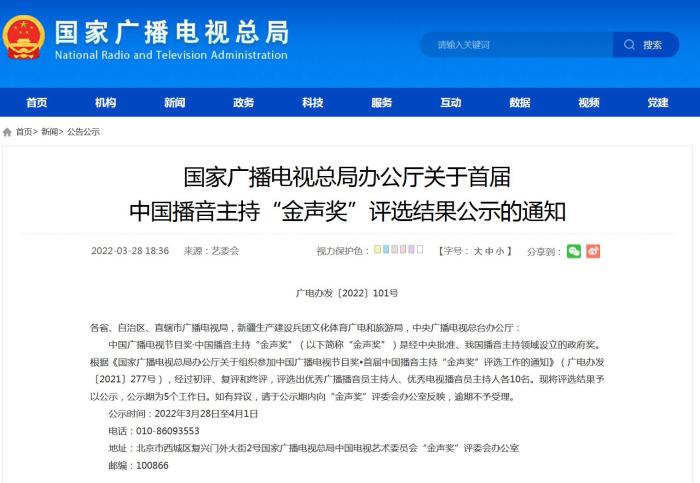中新網3月29日電 據國家廣電總局網站消息,國家廣播電視總局辦公廳近日發布關于首屆中國播音主持“金聲獎”評選結果公示的通知(以下簡稱《通知》)。