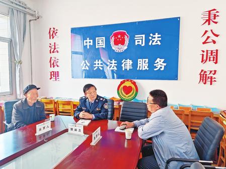 全國模范人民調解員、和政縣司法局三合司法所所長張仲勝傾心調解矛盾糾紛(4月20日拍攝)。 新甘肅·甘肅法制報記者陳孝志攝