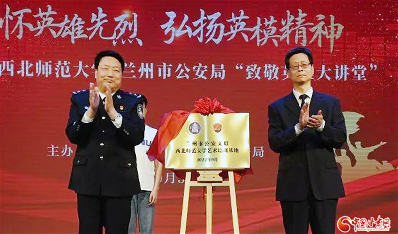 活動中,王立朝代表蘭州市公安局,接受了劉仲奎代表西北師范大學捐贈的8幅蘭州公安烈士畫像,向學校頒發收藏證書,并一同為“蘭州公安文聯西北師范大學藝術培訓基地”揭牌。蘭州公安竇勇烈士之子竇永杰、李鋼烈士之子李俊杰分別追憶父親的英雄事跡。“全國優秀人民警察”、城關分局直屬大隊大隊長張子劍,“全國公安機關愛民模范集體”代表、市局刑警支隊電信網絡案件偵查大隊民警陳薈文分別作分享報告。學校師生和市公安局民輔警代表共同演繹詩朗誦《是誰》、合唱《少年壯志不言愁》,以多種形式緬懷英烈,致敬英雄。
