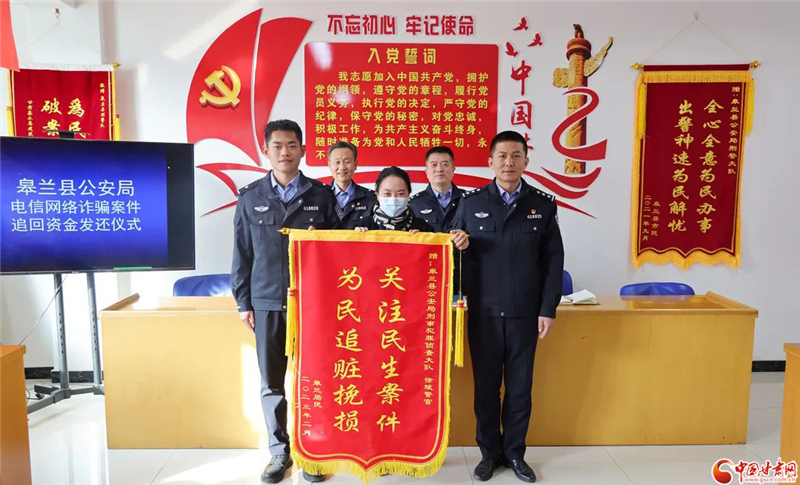 “沒想到還能追回被騙的錢,真心感謝皋蘭縣公安局的民警們。”返還儀式上,楊女士領回被騙資金,連聲道謝,并向辦案民警送上了一面印有“關注民生案件 為民追贓挽損”的錦旗,感謝民警全力偵辦案件,為自己挽回損失。