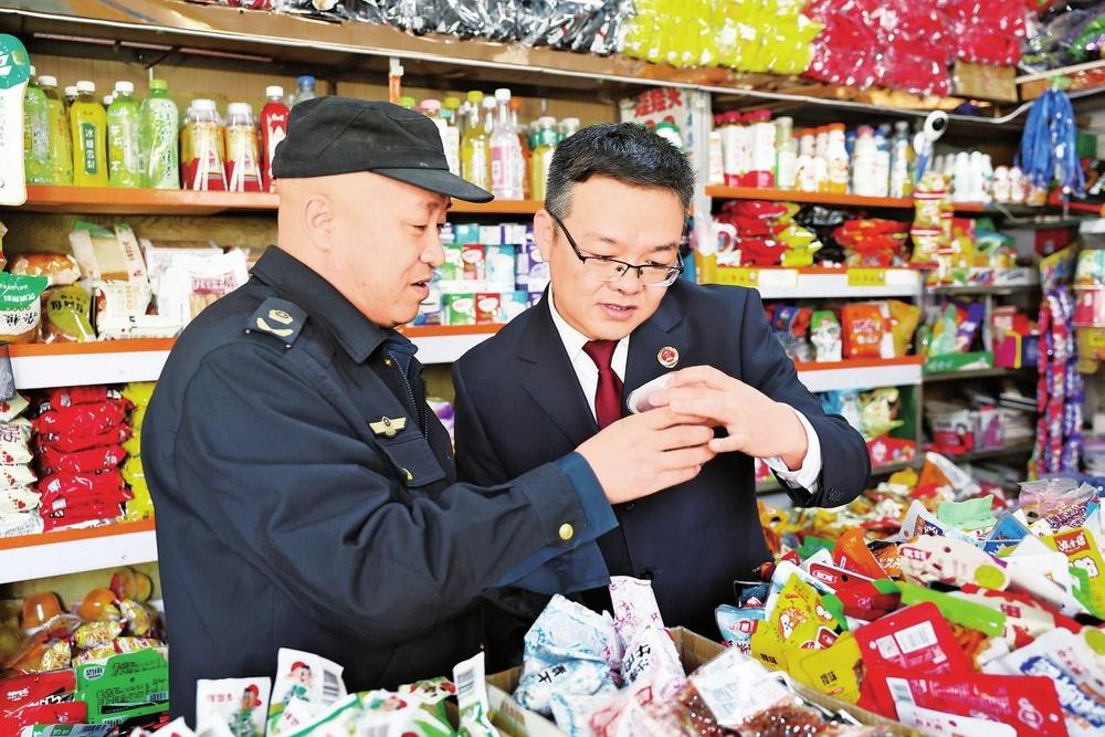 民勤縣檢察院聯合縣市場監管局對校園周邊小賣部、超市等重點場所開展食品安全專項檢查,護航未成年人健康成長(2024年3月25日拍攝)。