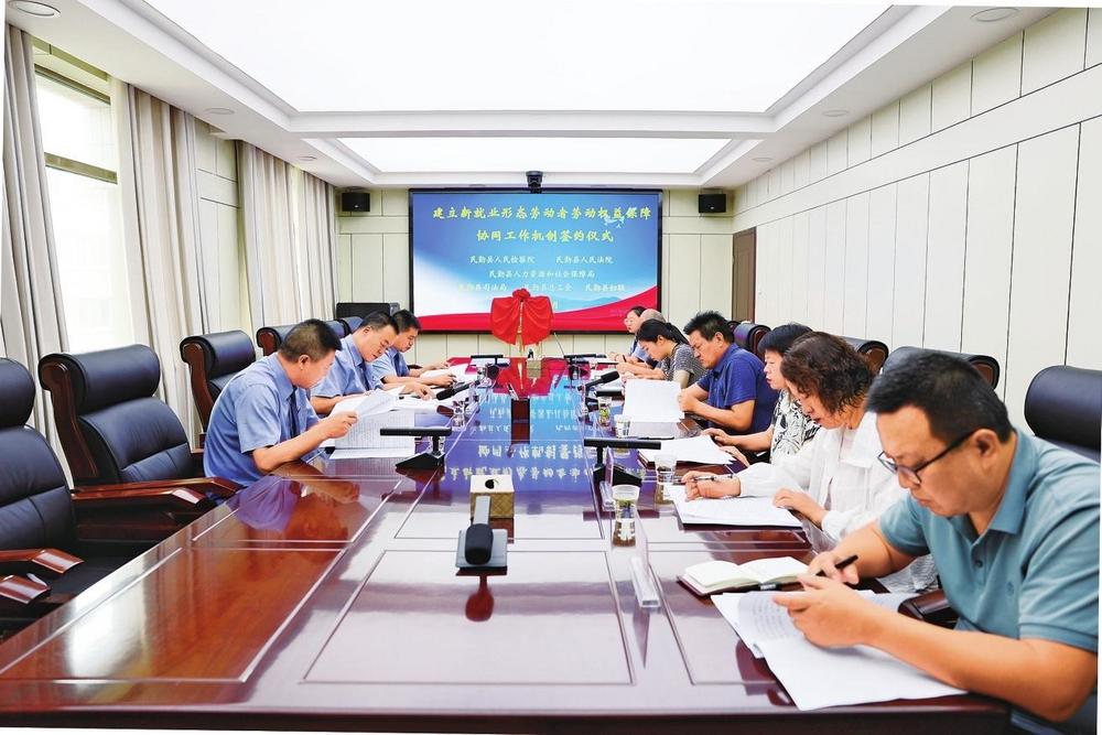 民勤縣檢察院邀請法院、人社、司法、工會、婦聯等部門單位召開座談會,共同簽訂《關于建立新就業形態勞動者勞動權益保障協同工作機制的意見》(2024年6月7日拍攝)。
