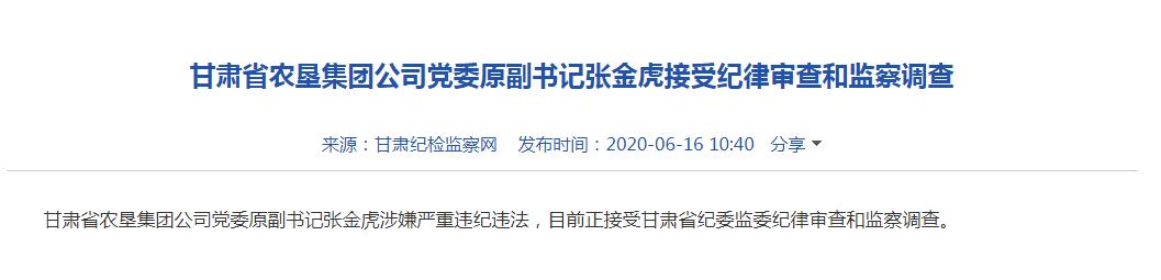 甘肅省農墾集團公司黨委原副書記張金虎涉嫌嚴重違紀違法,目前正接受甘肅省紀委監委紀律審查和監察調查。