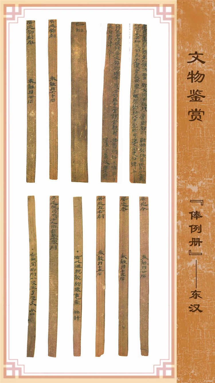 1974年8月出土于甲渠候官遺址第22號(hào)房址內(nèi)。簡(jiǎn)冊(cè)由10枚簡(jiǎn)組成,每簡(jiǎn)長(zhǎng)22.8厘米,前兩簡(jiǎn)寬2.5厘米,其余8簡(jiǎn)寬1.4厘米。全文200字。內(nèi)容為東漢建武三年(公元25年)竇融統(tǒng)治河西期間留下的一份完整的財(cái)政文書。簡(jiǎn)文是關(guān)于居延都尉府吏員奉谷標(biāo)準(zhǔn)的通知,由領(lǐng)河西五郡大將軍張掖屬國(guó)都尉竇融幕府下發(fā),簡(jiǎn)言“如律令”可知其指令具有法律效力。