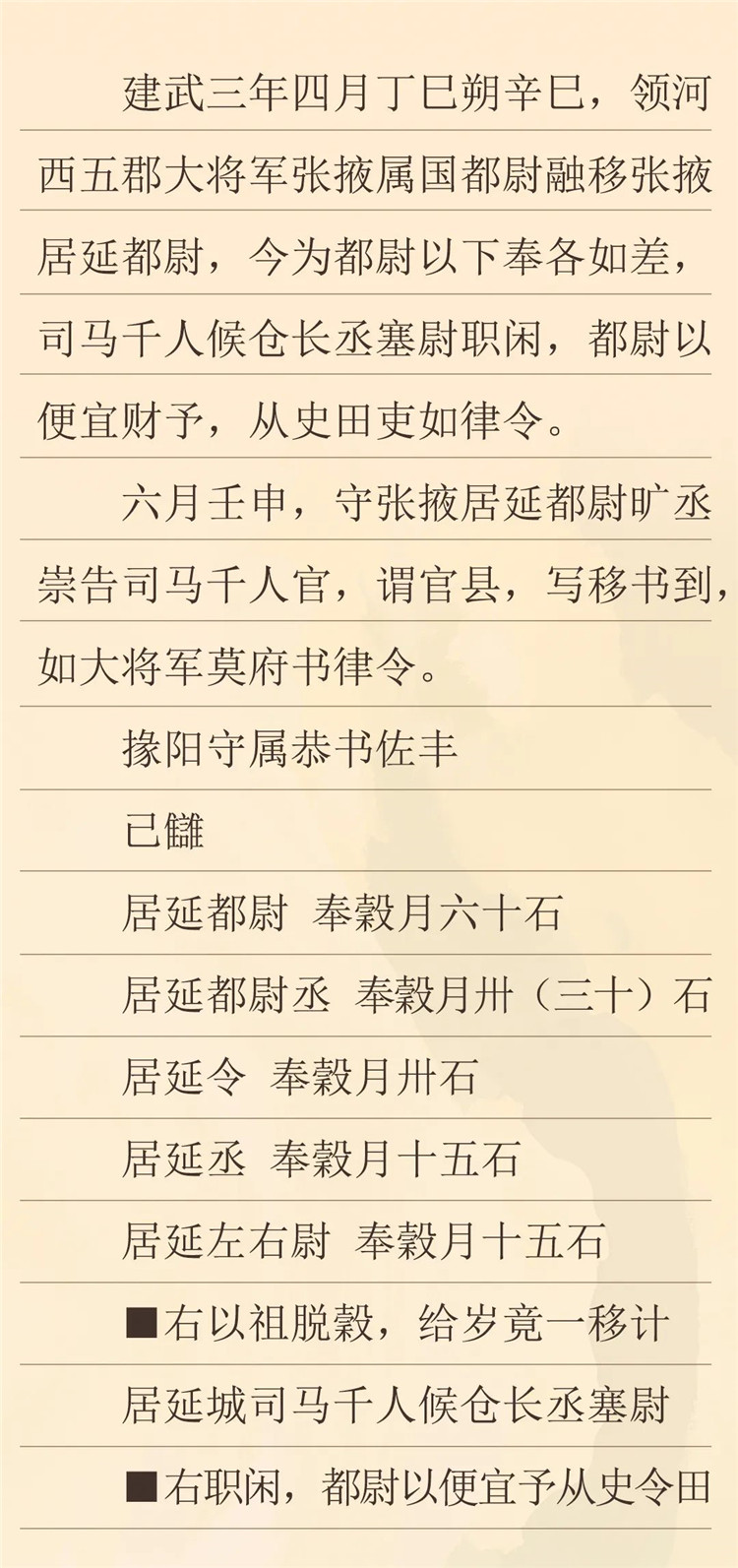 這封冊(cè)書記載了建武三年,竇融管轄河西時(shí)發(fā)布的一條關(guān)于都尉以下官吏奉谷等差的命令。根據(jù)竇融發(fā)布的新規(guī)定,我們可以看到,秩比二千石的居延都尉月奉谷僅為六十石,史書有“十斗一斛”及“十斗一石”的記載,此六十石即是六十斛,相比于史書記載中比二千石每月百斛的俸例要少,而其余官吏的俸祿也相應(yīng)要少,雖然漢代不同時(shí)期的官吏俸祿存在變化,但對(duì)比所見(jiàn)的這種情況,可能也跟兩漢之交戰(zhàn)亂頻仍的社會(huì)環(huán)境有重要關(guān)系。(李晶整理)