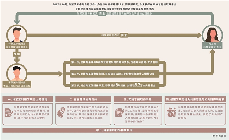國家工作人員林某某利用職務(wù)便利,安排下屬偽造資料幫助妻子陶某某辦理提前退休并領(lǐng)取養(yǎng)老金,認(rèn)定該行為構(gòu)成貪污,是基于哪些考量?B縣農(nóng)業(yè)開發(fā)公司為陶某某繳納的參保費(fèi)用,是否計入林某某貪污數(shù)額?我們特邀相關(guān)單位工作人員予以解析。