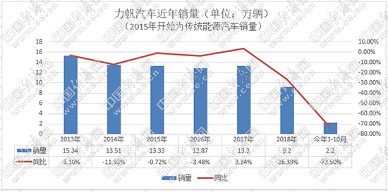 2006年,力帆推出首款轎車力帆520,新車不足5萬元的售價在當時引發關注,月銷量一度達到5000輛。2013年,力帆年銷售汽車15.34萬輛,成為汽車界的一匹黑馬。然而,好景不長。自2016年開始,力帆汽車進入下行趨勢,目前更是步履維艱。力帆產銷快報顯示,2019年1-10月,力帆傳統乘用車累計銷售2.2萬輛,同比下滑73.5%,10月僅銷售29輛;新能源累計銷售2458輛,同比下降65.42%,10月僅銷售423輛。