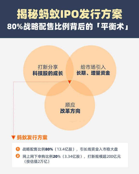 10月21日,科創板IPO獲證監會同意注冊后,螞蟻集團更新招股意向書并公布上市發行計劃。中證君發現,螞蟻設置了較高的戰配比例以穩定市場:戰略配售股票數占初始發行量的80%,約13.4億股。