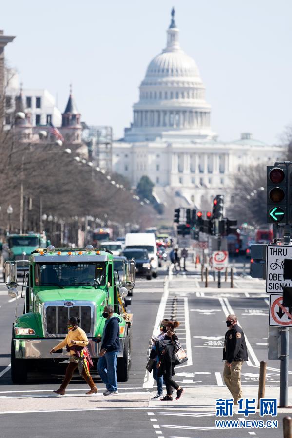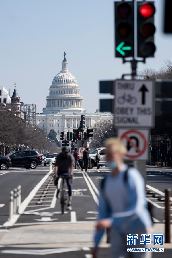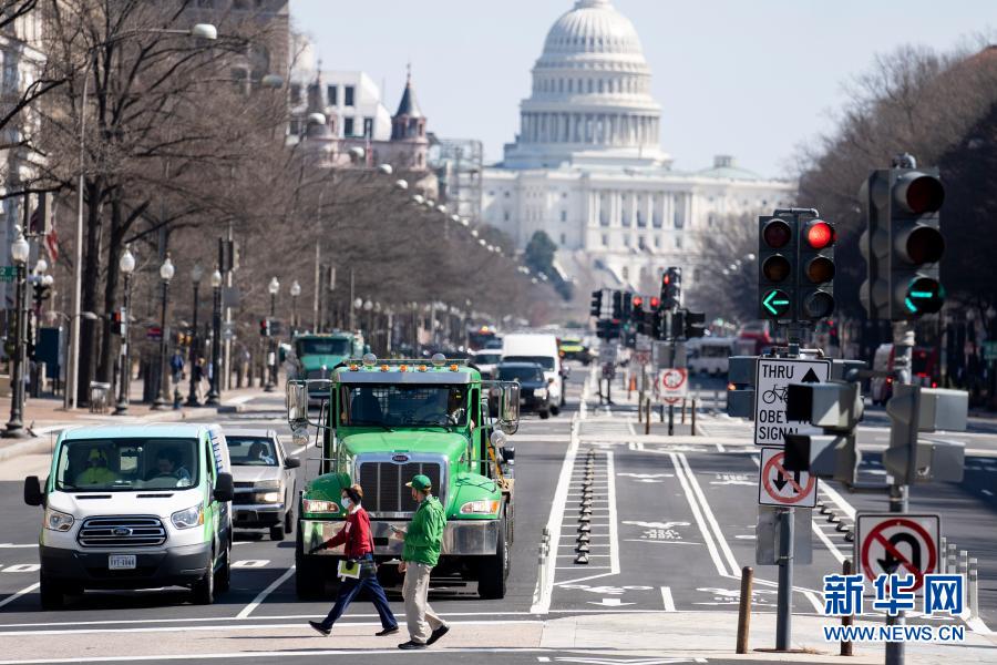 3月10日,在美國首都華盛頓,人們經過國會大廈附近的一處路口。新華社記者劉杰攝