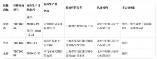 2021年上海市電動自行車產品質量監督抽查不合格產品