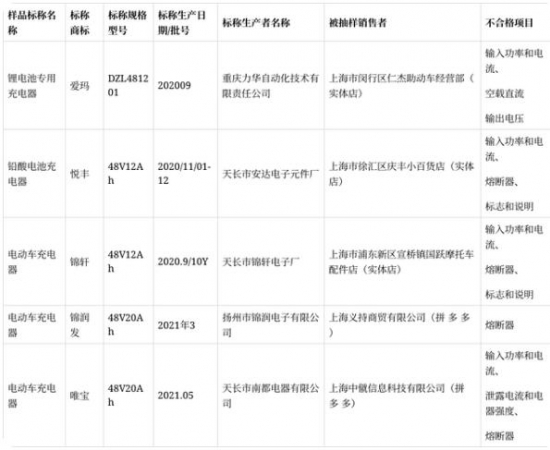2021年長三角聯動(上海)電動自行車用充電器產品質量監督抽查不合格產品