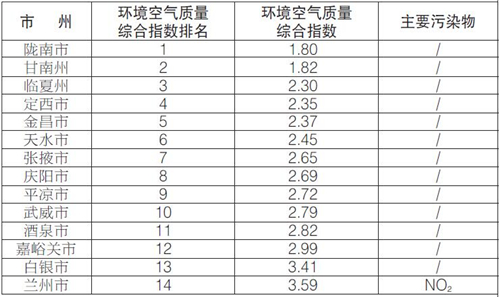 9月份,全省14個城市環境空氣質量綜合排名由好到差分別為:隴南、甘南、臨夏、定西、金昌、天水、張掖、慶陽、平涼、武威、酒泉、嘉峪關、白銀、蘭州。