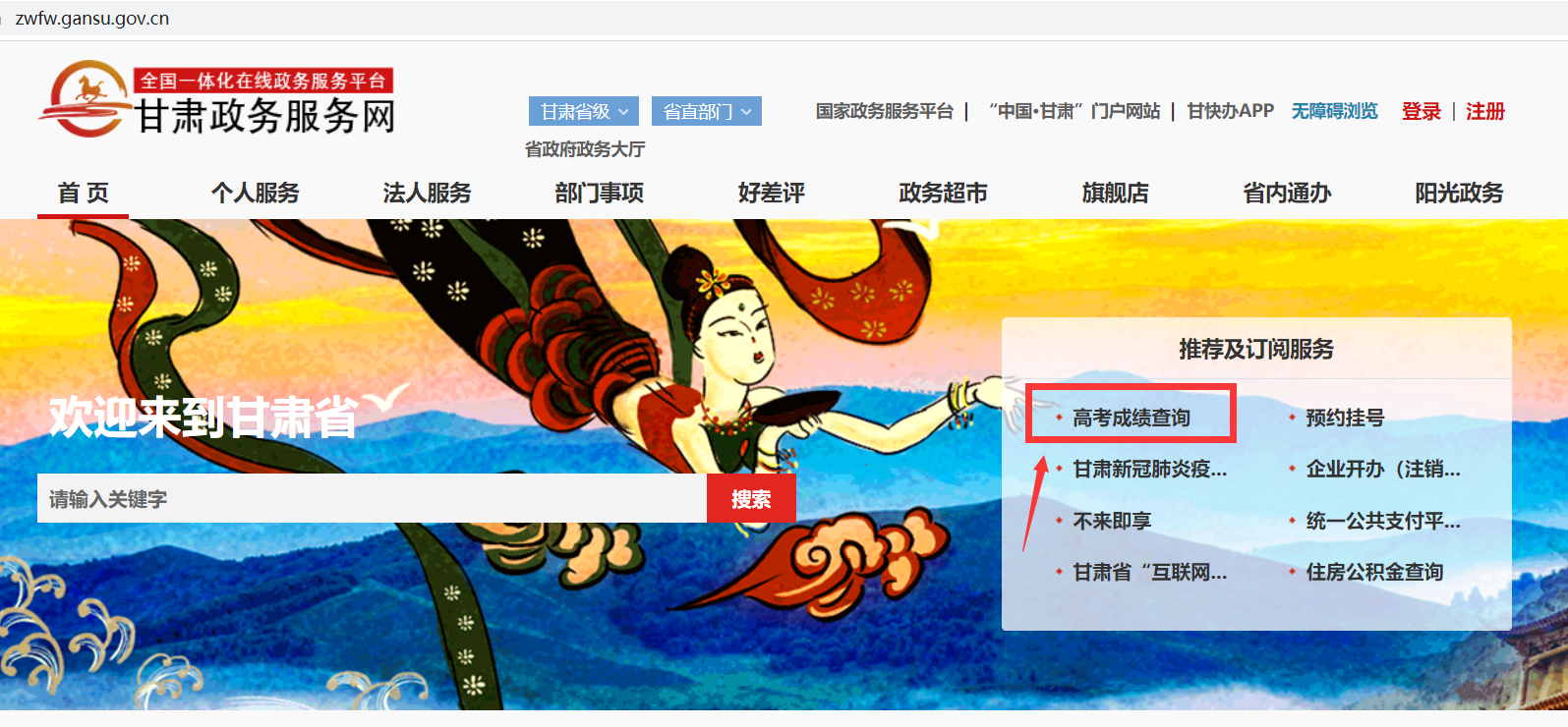 打開“甘肅政務服務網”https://zwfw.gansu.gov.cn/,在首頁“推薦及訂閱服務”欄目,點擊“高考成績查詢”進入查詢頁面,輸入考生號、身份證號即可查詢。