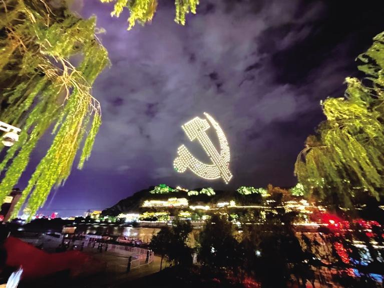 今夜的蘭州經過雨水的沖洗格外清爽嫵媚,在現場,600架無人機翱翔天空,照亮璀璨的蘭州之夜,無人機在遙控下變換著各種隊形和字樣,表達對黨的生日祝福。