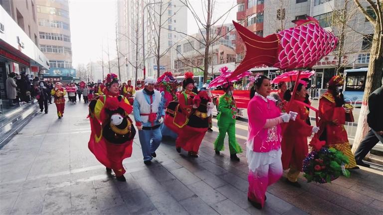 社區工作人員、舞獅隊、社火隊和大鼓隊為轄區居民帶來了扭秧歌、舞獅、敲大鼓、大頭娃娃和劃旱船等表演。