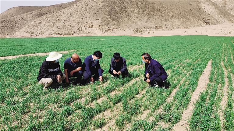 中國甘肅網5月11日訊 據蘭州日報報道(記者 程珊珊 文/圖)走進皋蘭縣石洞鎮鎮東灣村的田間地頭,只見綠油油的麥田分布在村道兩旁,蘊含綠色的期盼。皋蘭縣農技中心主任王朝軍又下地了,帶著小鏟子、鋼卷尺等幾件從不離身的家伙。走進麥田觀察根系、測量株高,細心查看苗情、墑情、肥情以及病蟲害情,而他的身邊還圍著不少村里的種糧大戶。