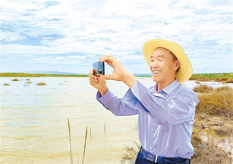 郭萬剛格外珍惜這一灘湖水,他沿著水岸走了很久,還不時地用手機拍照,他認為這是大自然對古浪持續開展生態建設的回報。“我今年70歲了,這是我第一次在這片沙漠里見到湖泊,給它取名‘紅沙湖’,希望它像沙漠里的紅柳一樣永遠充滿生機,不要干涸。”郭萬剛說。