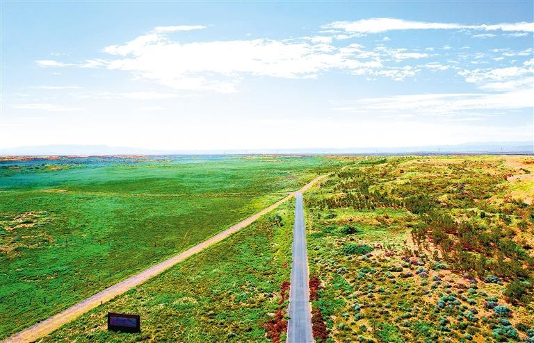 古浪縣北部沙區十二道溝附近,綠色在沙漠中延伸。新甘肅·甘肅日報記者 金奉乾