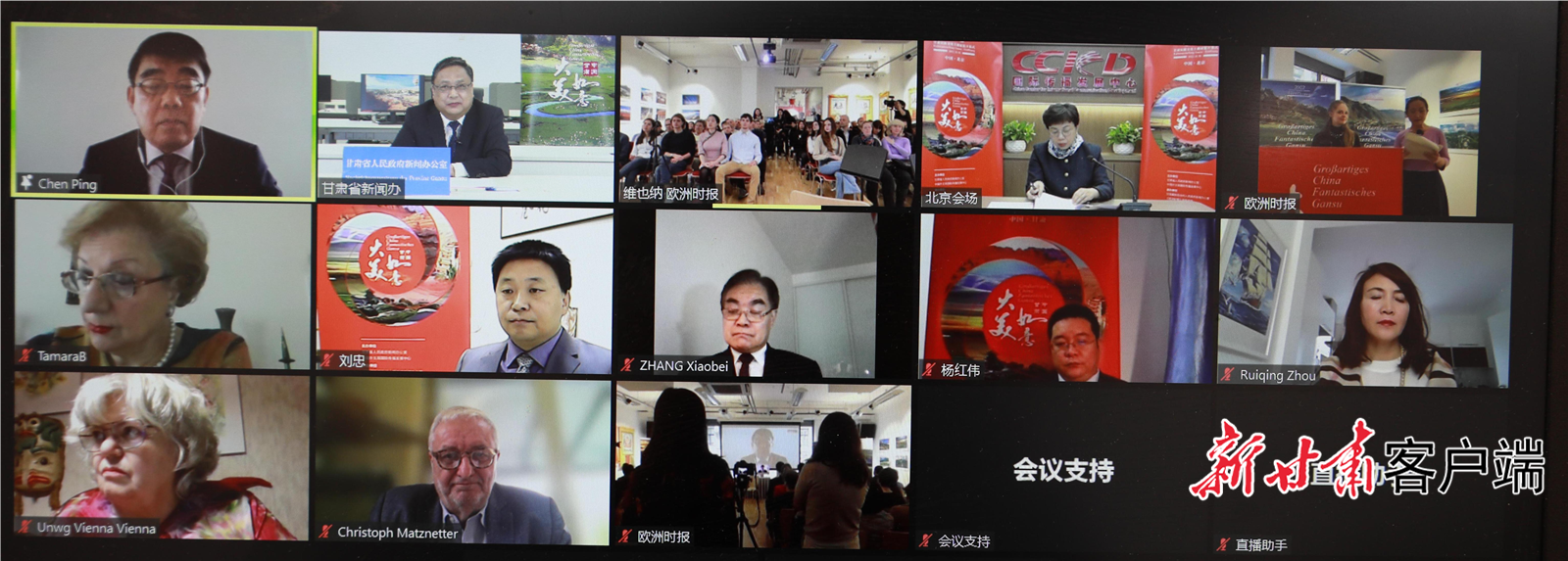 主題展開幕式上,甘肅省委宣傳部副部長、省政府新聞辦主任郭錦詩致歡迎辭,并介紹主題展覽情況。中國駐奧地利大使館文化參贊陳平,維也納聯合國婦女協會主席桑迪亞·普瑞拉,中國外文局副總編輯、國際傳播發展中心主任陳實,奧地利聯邦商會副主席克里斯托弗·馬茨內特,歐洲時報文化傳媒集團總裁,歐洲時報社社長張曉貝出席開幕式并致辭。甘肅省委宣傳部副部長、省政府新聞辦主任郭錦詩線上出席并宣布主題展開幕。