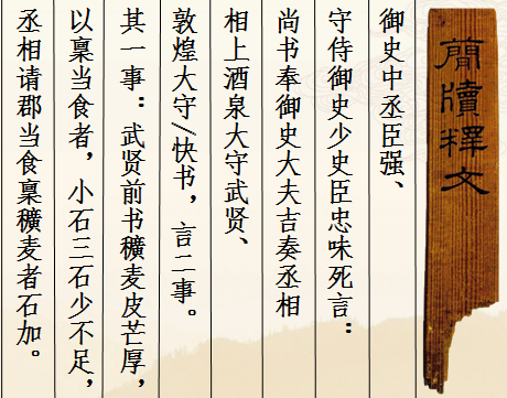 此簡為漢宣帝回復酒泉太守“辛武賢”和敦煌太守“快”奏疏的恩準詔書,簡文記載的是皇帝詔書中對兩太守奏疏內容的復述。從簡文內容看,酒泉太守辛武賢和敦煌太守快給朝廷的奏疏主要涉及兩件事情:一是辛武賢認為作為糧草的穬麥因皮厚芒長,如按規定每人發放小石三石,會造成實際數量的不足,所以他請求皇帝每石加發若干。另一件事顯然是敦煌太守快的上書,但文字未能容納于此簡,故不得而知。