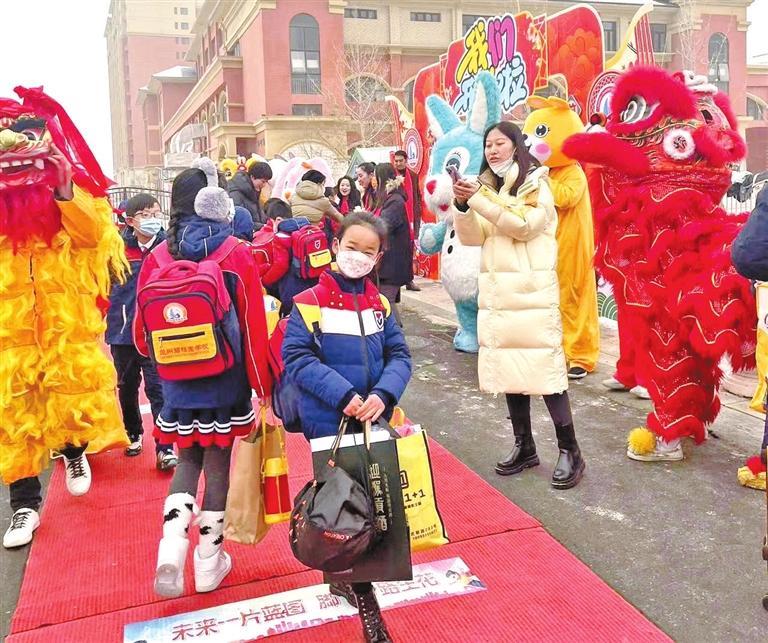 氣球、棒棒糖、筆記本……每一份開學小禮物都蘊藏著老師們深深的祝福和殷切的期望,打開這份開學禮,五彩斑斕的新學期已經畫下了濃墨重彩的第一筆。猜燈謎、寫春聯、做花燈、觀看太平鼓表演、舞獅子、趣味套圈、扭秧歌……多姿多彩的迎接活動,將傳統文化與有益的游戲結合起來,營造出愉悅的開學氛圍。