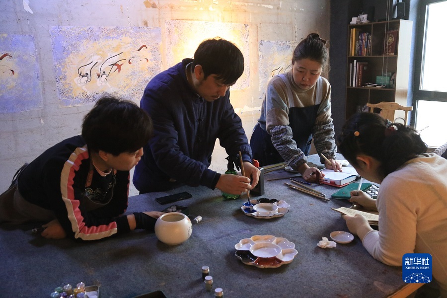 2月22日,在敦煌小鎮鳴沙書院,藝術工作者張杰龍(中)指導學員進行顏料調色。