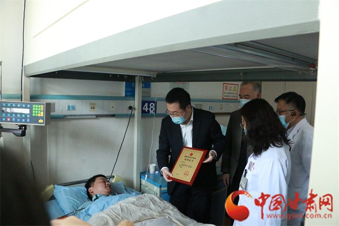 甘肅省紅十字會(huì)黨組書記、專職副會(huì)長楊芳勝為甘肅省第54例造血干細(xì)胞捐獻(xiàn)者龔先生頒發(fā)“博愛金獎(jiǎng)”和榮譽(yù)證書